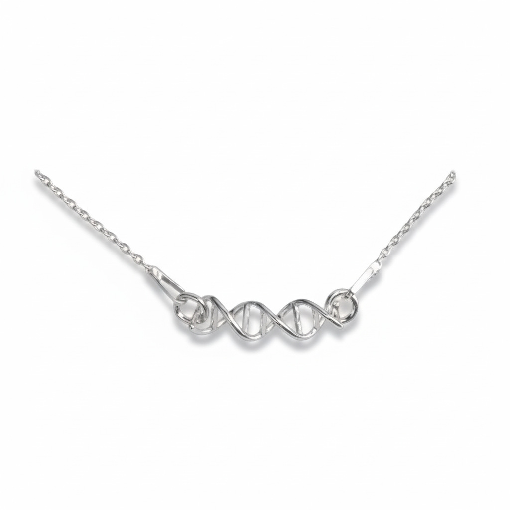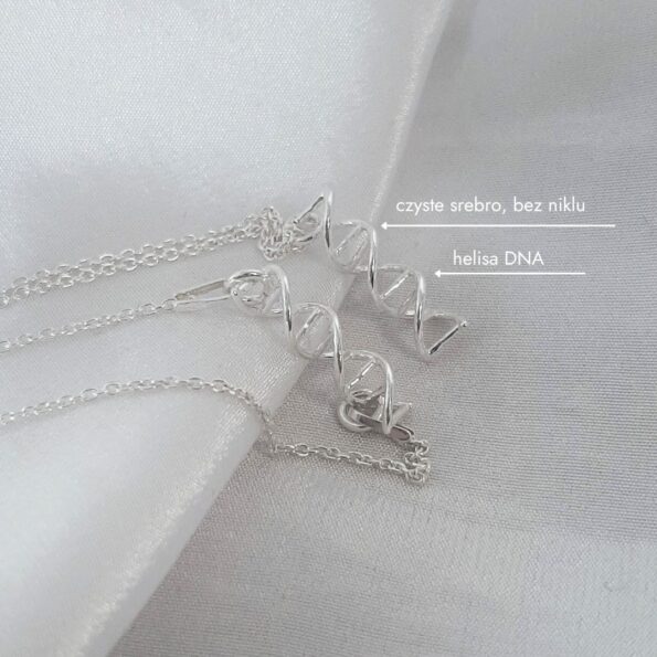 Dwuczęściowy, srebrny łańcuszek z łącznikiem z podwójnej helisy DNA. Wybierz pokrycie srebra: