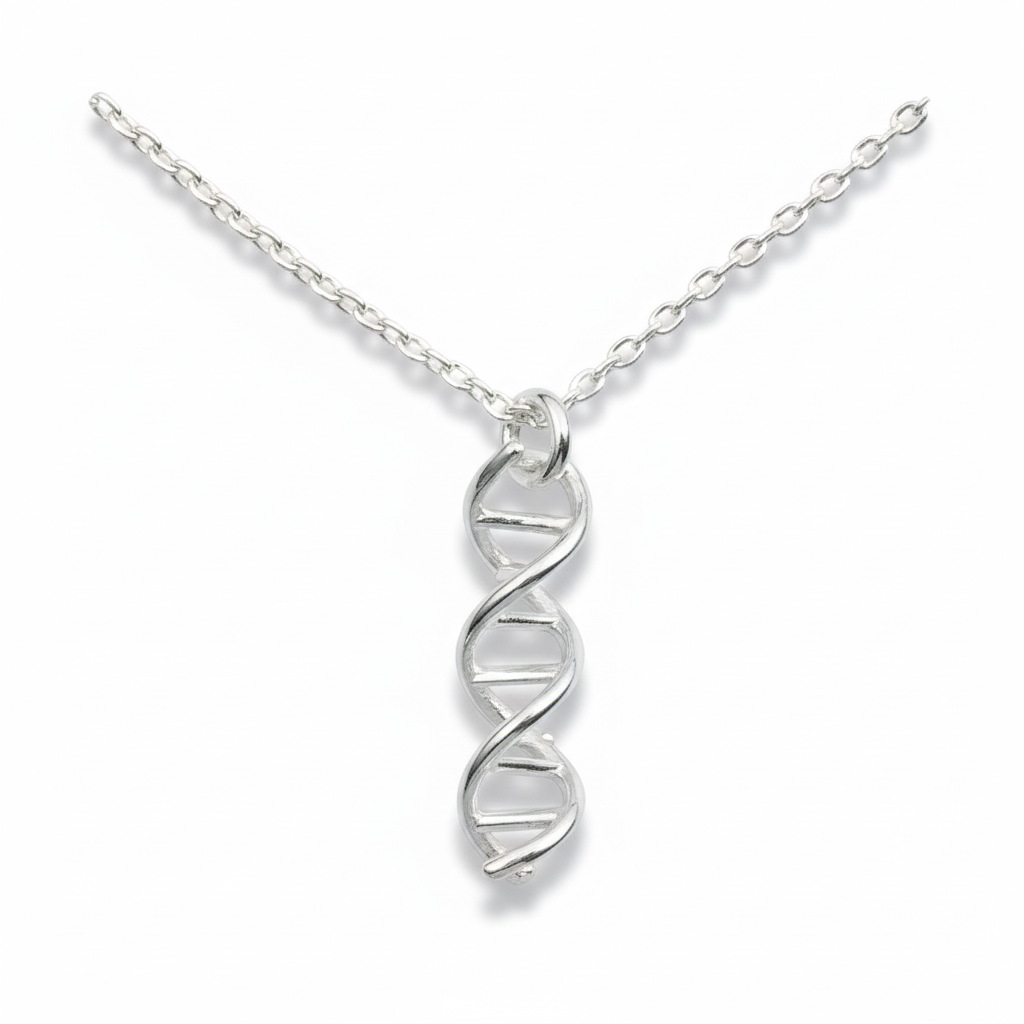 Klasyczny, srebrny łańcuszek z zawieszką z helisą DNA.